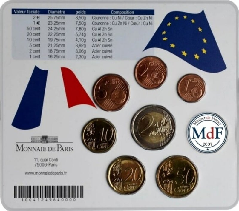 Série Euros officiels de la Monnaie de Paris sous blister minisets à tirage limité comprenant les 8 pièces France 1 centime à 2 euros millésimées à tirage limité en qualité BU - Brillant universel : monnaie neuve frappée en série limitée avec des flans neufs et qui a gardé son brillant d'origine. C'est le niveau intermédiaire entre la belle épreuve et la monnaie de circulation.