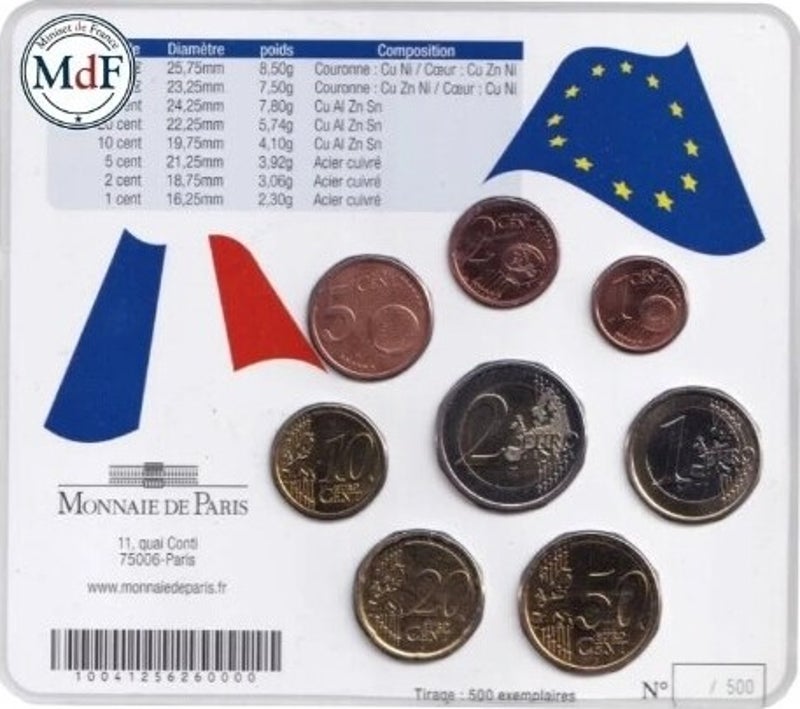 Série Euros officiels de la Monnaie de Paris sous blister minisets à tirage limité comprenant les 8 pièces France 1 centime à 2 euros millésimées à tirage limité en qualité BU - Brillant universel : monnaie neuve frappée en série limitée avec des flans neufs et qui a gardé son brillant d'origine. C'est le niveau intermédiaire entre la belle épreuve et la monnaie de circulation.