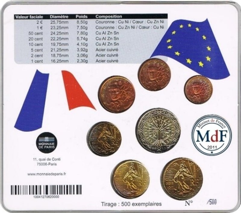 Série Euros officiels de la Monnaie de Paris sous blister minisets à tirage limité comprenant les 8 pièces France 1 centime à 2 euros millésimées à tirage limité en qualité BU - Brillant universel : monnaie neuve frappée en série limitée avec des flans neufs et qui a gardé son brillant d'origine. C'est le niveau intermédiaire entre la belle épreuve et la monnaie de circulation.
