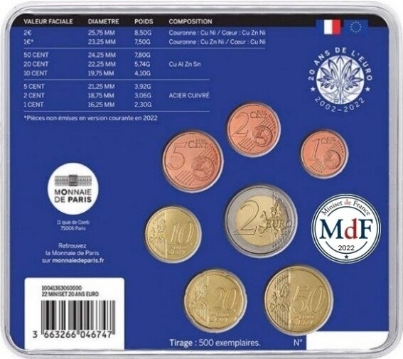 Série Euros officiels de la Monnaie de Paris sous blister minisets à tirage limité comprenant les 8 pièces France 1 centime à 2 euros millésimées à tirage limité en qualité BU - Brillant universel : monnaie neuve frappée en série limitée avec des flans neufs et qui a gardé son brillant d'origine. C'est le niveau intermédiaire entre la belle épreuve et la monnaie de circulation.